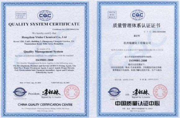 Company has been awarded the Quality System Certificate by reason of our Quality Management System for compliance with teh standard ISO 9001:2000 by the China Quality Centre (CQC) in 2003 . The Certificate No.:3302/200422386